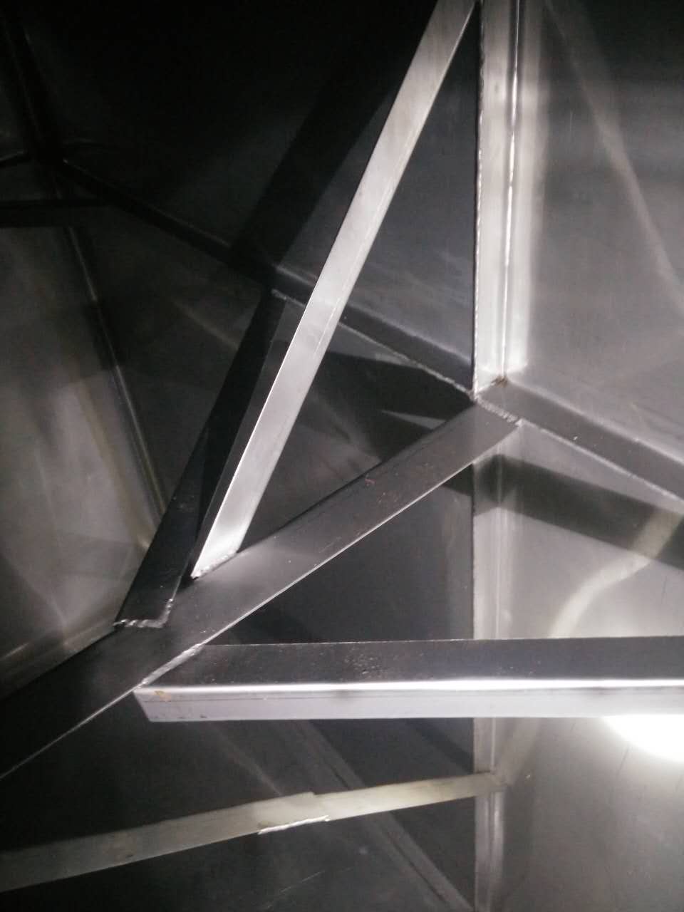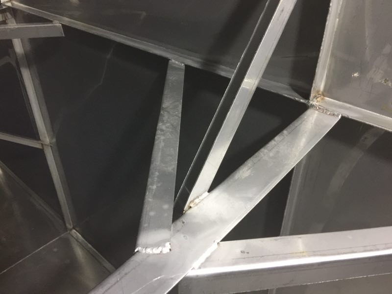 斜拉主要的作用在于分擔(dān)主拉筋的拉力,進(jìn)一步對(duì)水箱板進(jìn)行穩(wěn)固,切成500mm的長度,連接在水箱與主拉之間。形成龍爪式,常規(guī)尺寸為4cm*1cm厚度一般以靠近頂部的側(cè)板厚度為基準(zhǔn),連接處必須進(jìn)行滿焊處理。